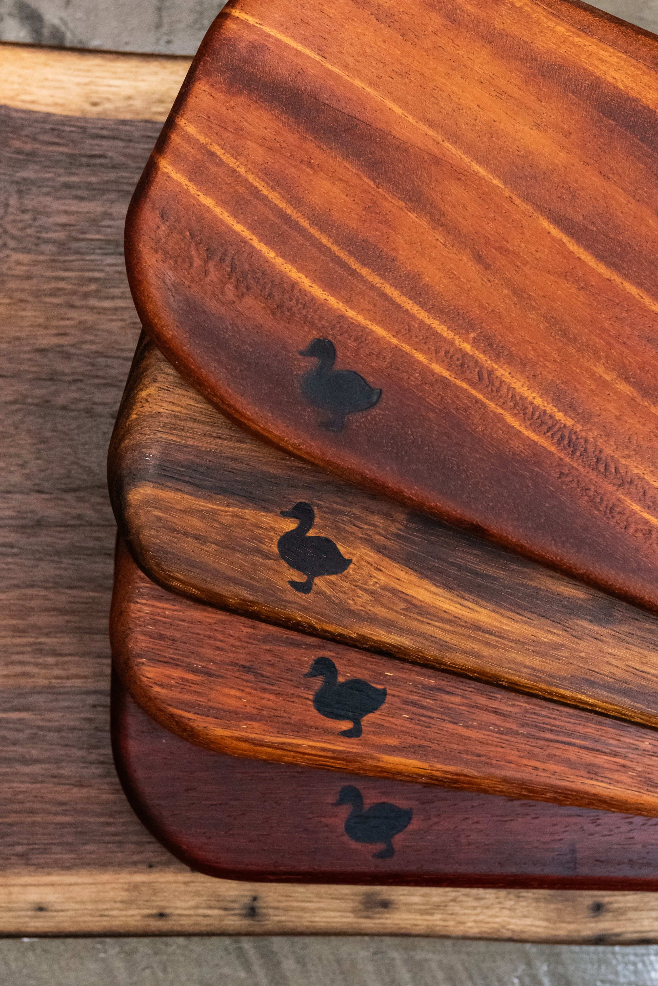 Wooden Duck Artisan Goods handcrafts charcuterie boards and centerpieces from responsibly sourced woods — each one shaped, oiled, and branded by hand. Inspired by our shop companion, Ducky, we create pieces that honor the tree, the craft, and the joy of simple, lasting design.