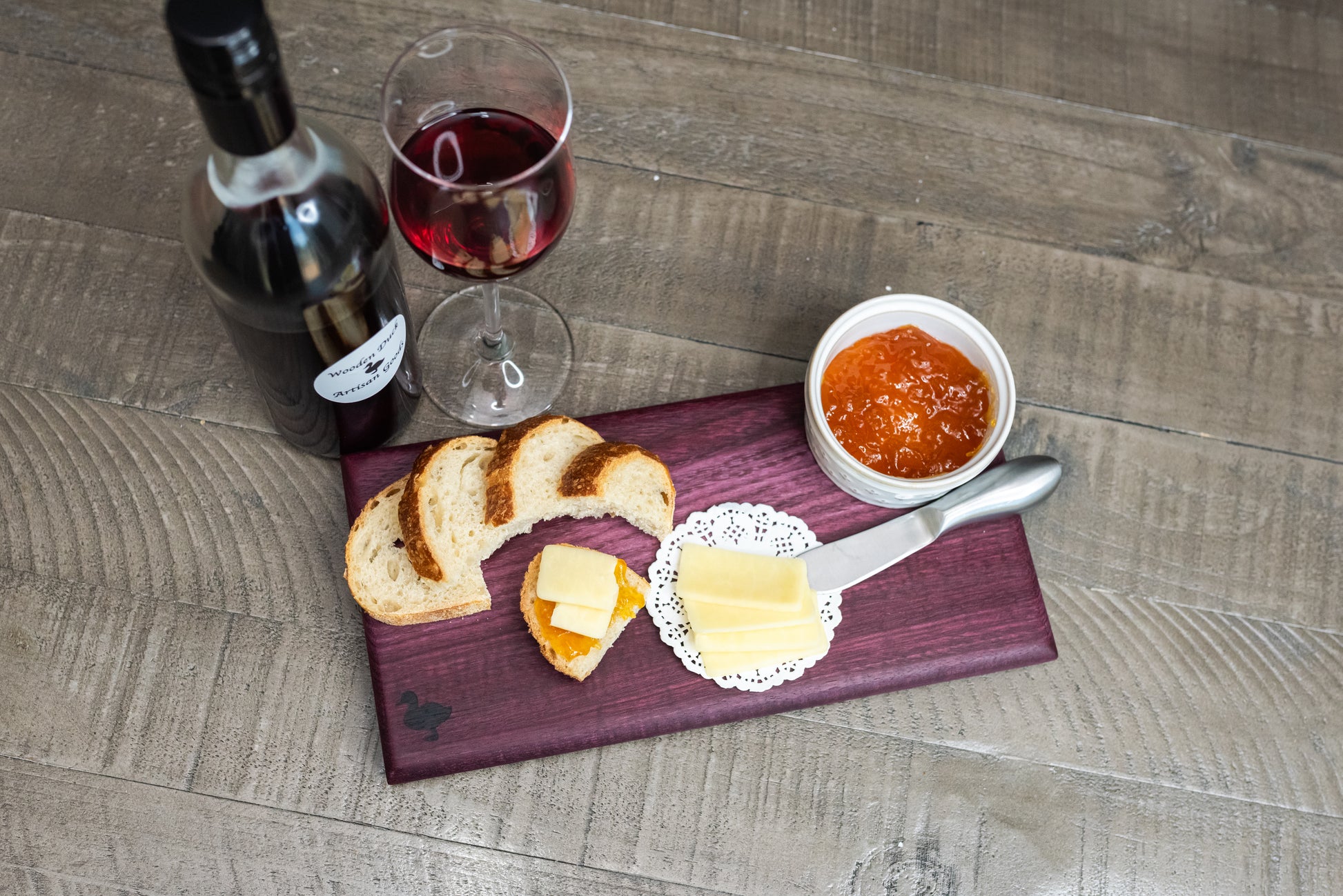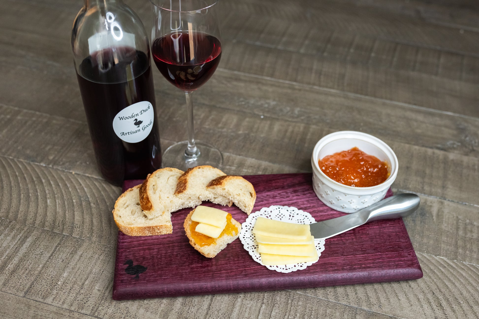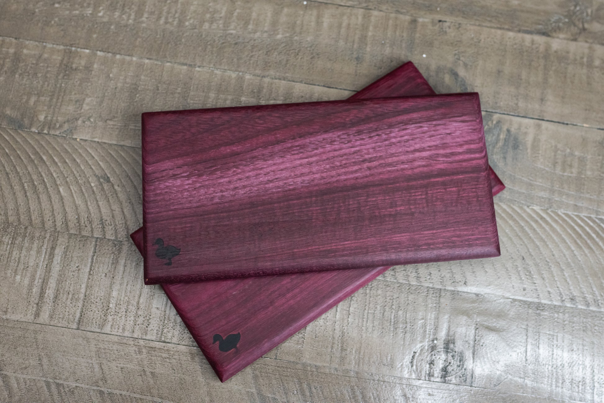 Add a splash of vibrant color to your serving experience with this handcrafted Purpleheart charcuterie board. With your choice of 12" or 18" length and rectangular or oblong shape, this board showcases the stunning deep purple hues unique to Purpleheart wood, paired with smooth routed edges, a silky sanded finish, food-safe oil, and artisan branding for a truly special piece.